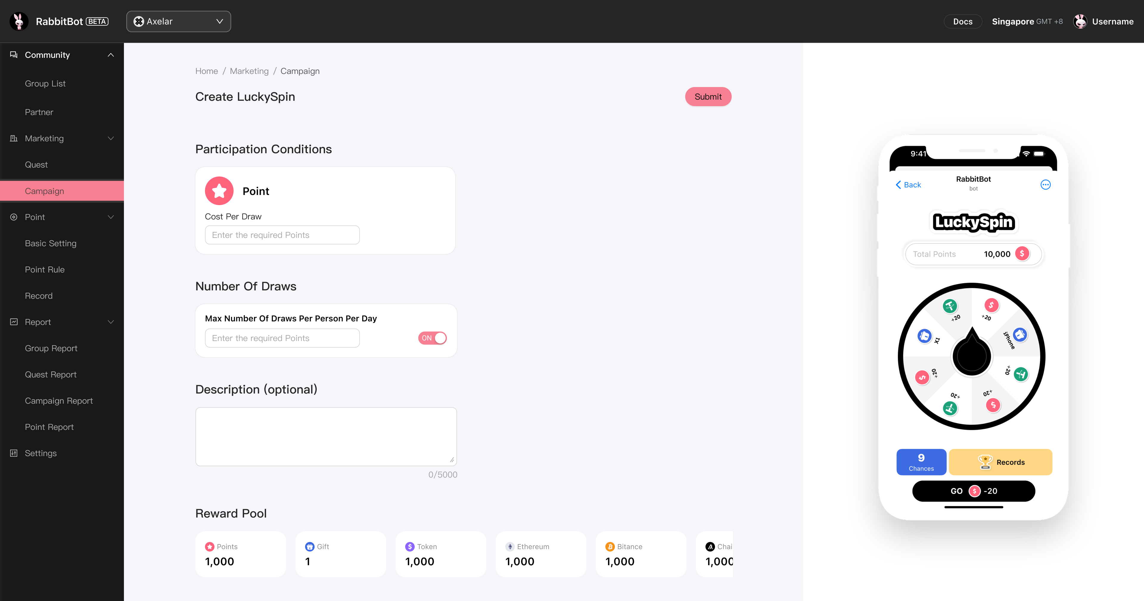Q&A, referral campaigns, seasonal promotions, and points tracking in Web3 communities.